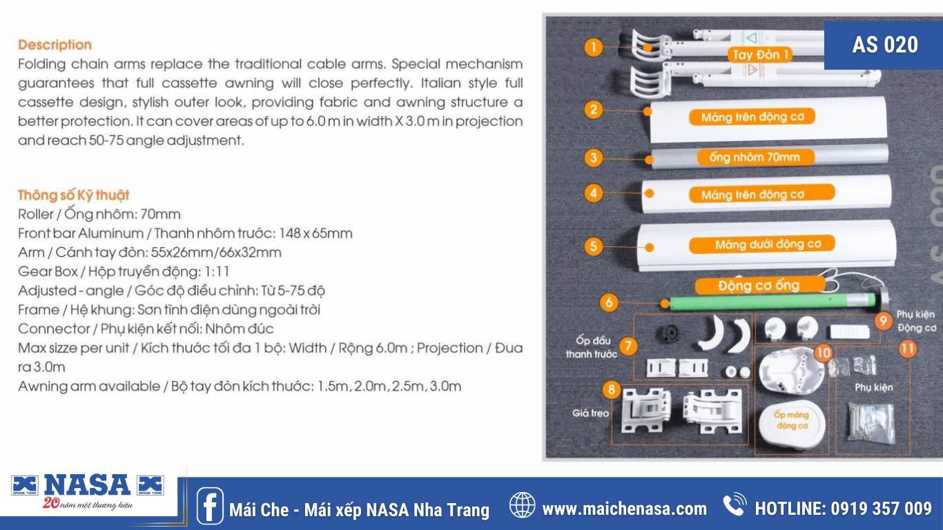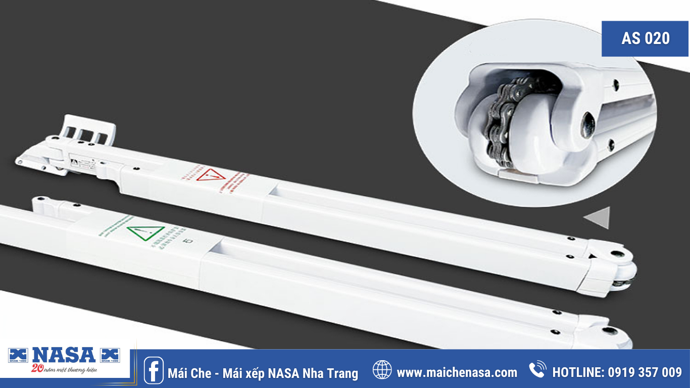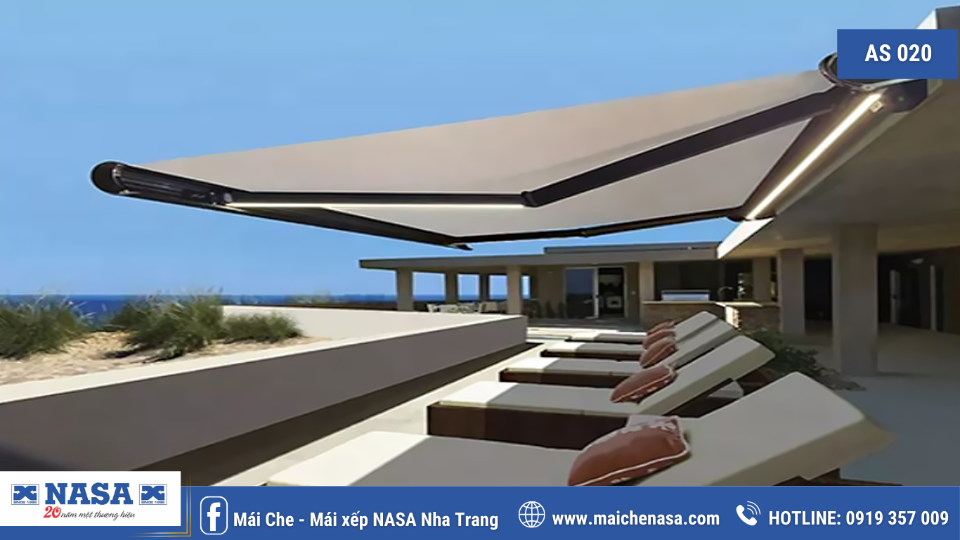 Mái hiên AS 020 có thể tích hợp với hệ thống đèn LED chạy dọc cánh tay càng, hãy thông báo với NASA Nha Trang nếu bạn muốn sử dụng tay càng có đen LED.